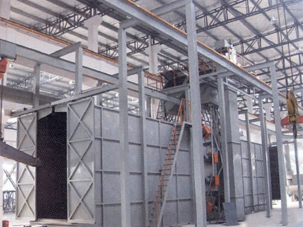 拋丸機清理室內(nèi)熱區(qū)采用軋制Mn13 板防護,相對于以前的橡膠板防護,其使用壽命大大提高,且外形美觀、易于更換,是當今相對流行的清理機室體防護方式。